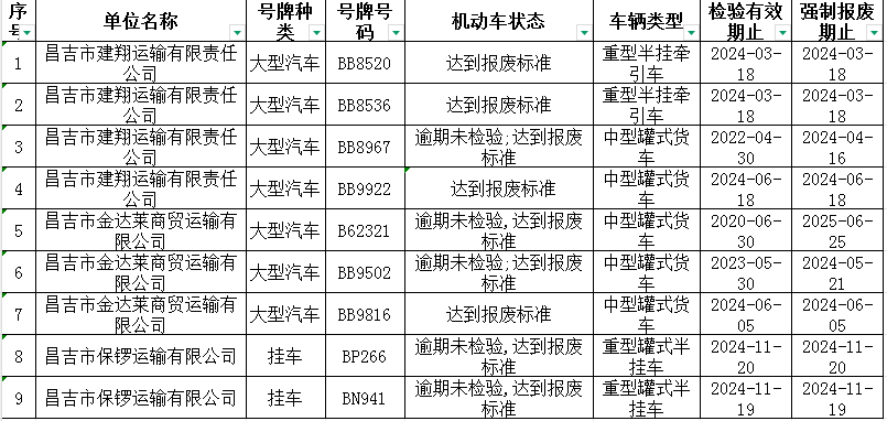 【行政强制】昌吉市“两客一危”逾期未检验、未报废及临界检验、报废车辆信息公示