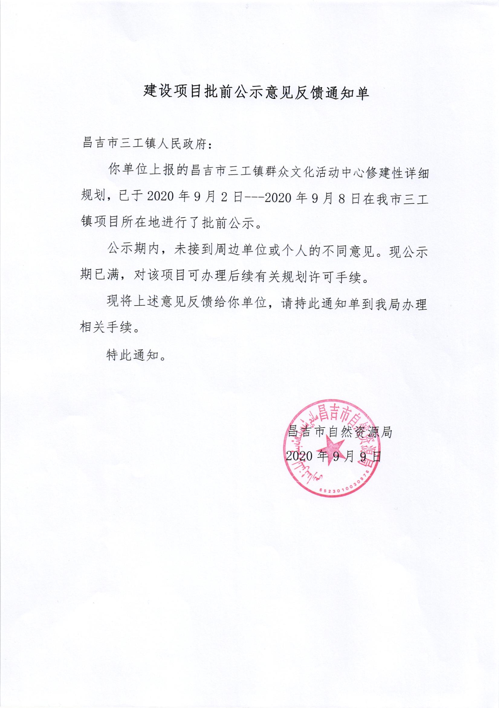 三工镇群众文化活动中心项目批前公示意见反馈通知单