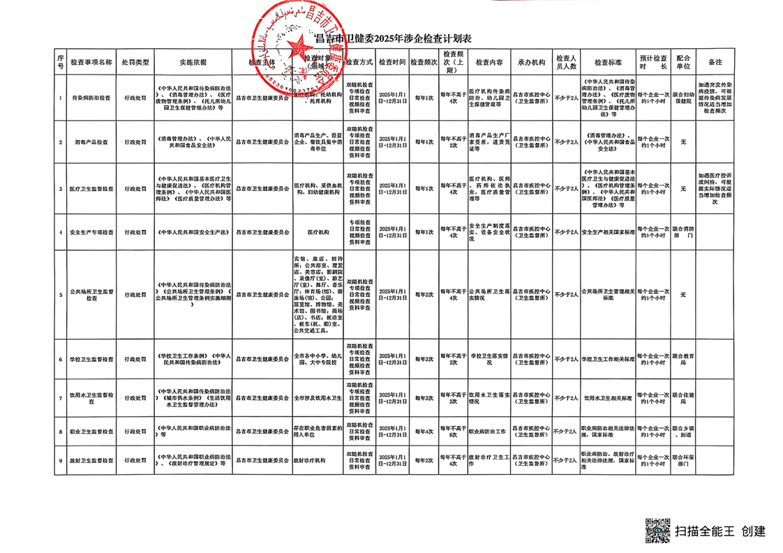 昌吉市卫生健康委员会2025年涉企检查计划表