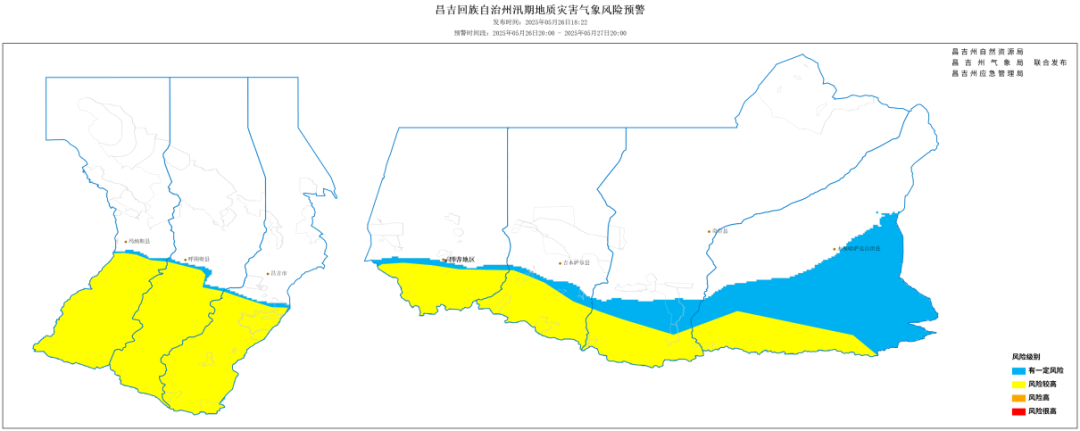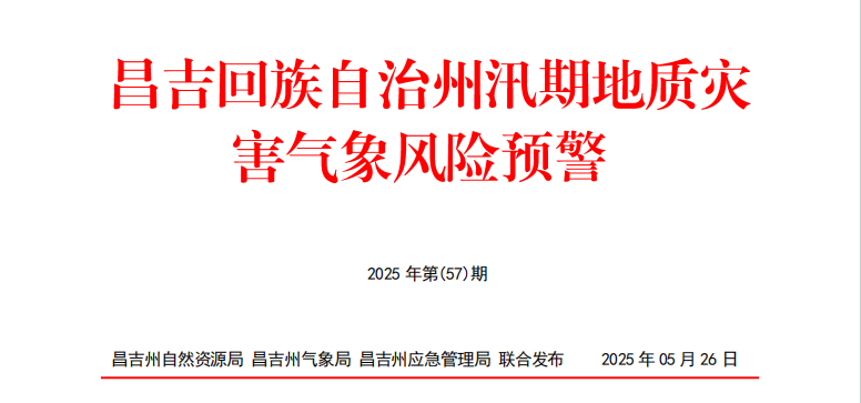 5月26日20时至5月27日20时,根据未来24小时天气情况,预测吉木萨尔县(三台镇、大有镇、庆阳湖乡、新地乡、泉子街镇、老台乡)、阜康市(三工河哈萨克民族乡、上户沟哈萨克民族乡、城关镇、水磨沟乡、甘河子镇)、呼图壁县(石梯子哈萨克民族乡、雀尔沟镇)、木垒哈萨克自治县(博斯坦乡、大南沟乌孜别克乡、大石头乡、木垒县东城镇、木垒县西吉尔镇、照壁山乡、白杨河乡、英格堡乡)、昌吉市(庙尔沟乡、硫磺沟镇、阿什里哈萨克民族乡)、玛纳斯县(塔西河哈萨克民族乡、旱卡子滩哈萨克民族乡、清水河子哈萨克民族乡)、奇台县(七户乡、东湾镇、五马场乡、半截沟镇、吉布库镇、塔塔尔乡、碧流河乡)发生崩塌、滑坡、泥石流等地质灾害的风险较高(黄色预警)。