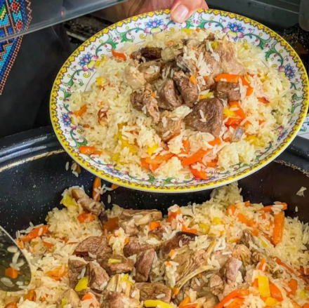 油亮的抓饭里,羊肉酥烂,胡萝卜甘甜,米饭吸足了肉香与油香,一勺下去,满口浓香,幸福感爆棚!