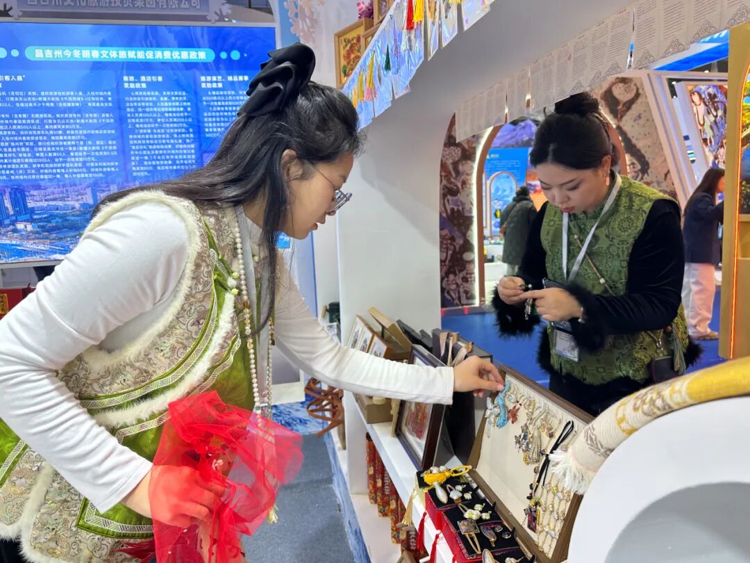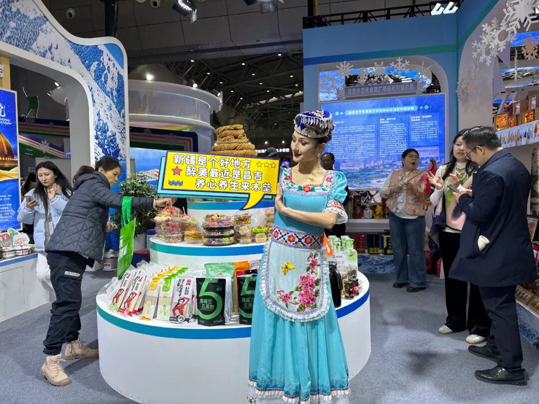走进新疆国际会展中心4号馆昌吉州展厅,油糕、馓子、椒麻鸡等特色美食香气扑鼻、格外诱人,只见参展商一边品尝着美食,一边翻看着旅游推介手册了解昌吉州的特色旅游资源。天山天池明信片、北庭套杯、葫芦雕刻等精美文创产品备受游客青睐,奇台腰站子面粉、木垒鹰嘴豆、葡萄酒等特色农副产品深受欢迎。展厅外,LED大屏幕上滚动播放着昌吉州旅游宣传推介片,新疆花儿等特色歌舞表演吸引游客驻足。活动现场,天山天池滑雪场、五江温泉城、玛纳斯国家湿地公园等景区工作人员还为过往游客免费赠票。