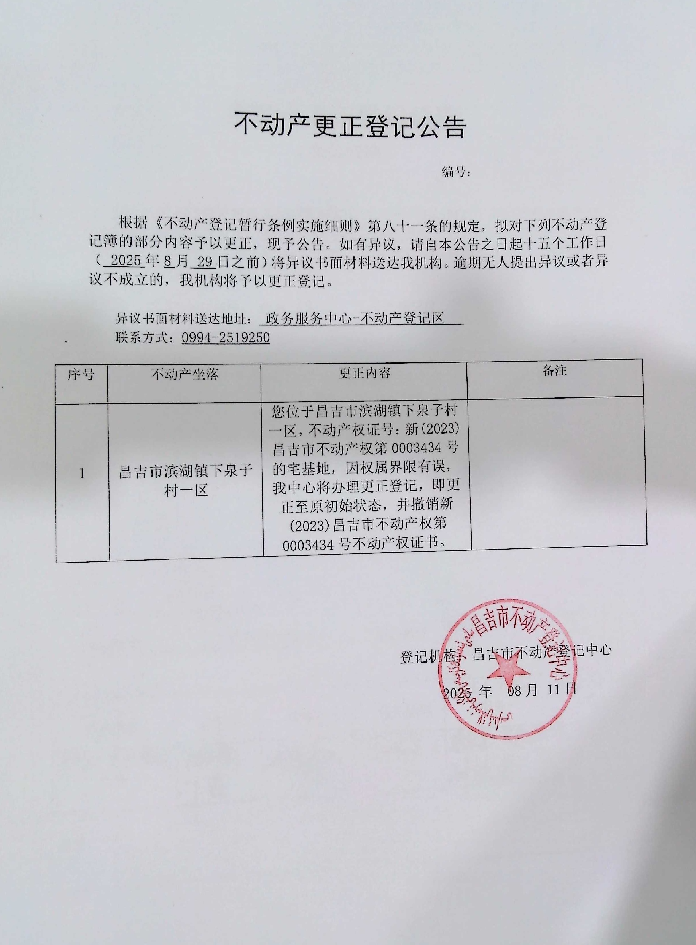 不动产更正登记公告-昌吉市滨湖镇下泉子村一区