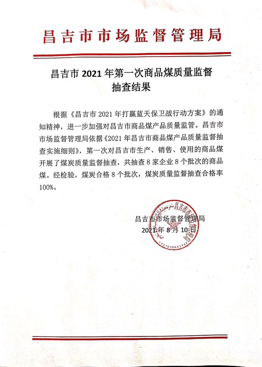 【抽检结果信息】昌吉市2021年第一次商品煤质量监督抽检结果