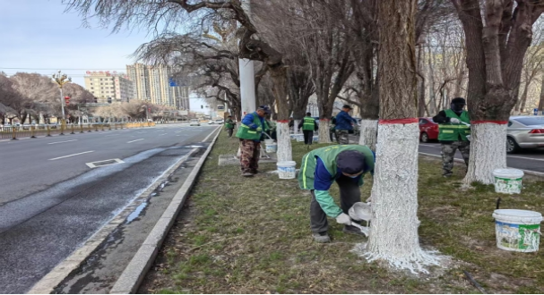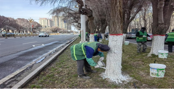 树木涂白是林木春季养护管理的一项重要内容,它不仅能够美化城市环境,而且能够有效预防天牛、吉丁虫等林木蛀干害虫对树木的伤害,增强树木抵御病虫害的能力,同时对树木还能够起到防晒、锁水、防裂等保护作用。昌吉市园林绿化管理中心从4月4日开始,组织各养护站所的人员,按照树木涂白剂药物成分浓度的配比,配制好树木涂白剂,在树木涂白作业时保持白度均匀、刷口平整、高度一致、不留死角等技术要求,对市区95条道路、5个公园、3个广场、69个游园、1个景观带及两个园区(昌吉国家高新技术产业开发区、昌吉国家农业高新技术产业示范区)的57条道路、2个公园、3个广场、7个游园、1个景观带近20万余株树木进行春季树木涂白作业。