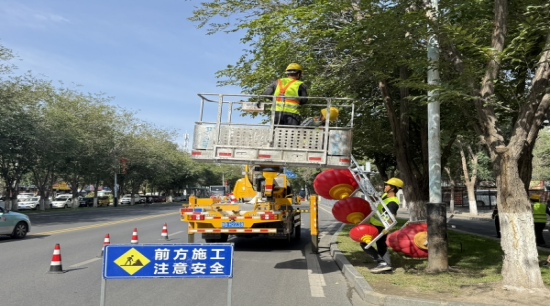 8月18日,市政养护工人在昌吉市宁边更换大红灯笼