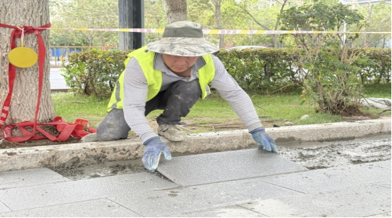 笔者在绿洲路人行道提升改造施工现场看到,几名身穿黄色反光马甲的工人正在忙碌着。他们将人行道上原先陈旧的人行道砖拆除后,便在人行道的两侧栽设了路沿石,然后再在清除干净的路基上浇筑混凝土垫层,待混凝土凝固后再铺上一层砂浆调整地面的平整度,最后是用砂浆将石英石砖贴在混凝土基础上,确保每块砖都紧密贴合水平一致。
