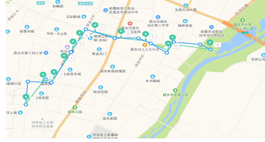 途经站点:吉祥花园--亚中时代帝景—华尔兹音乐城--华洋广场--江南小镇--上海花园—市八小--地质村—世纪花园北门--文化宫—农机校—热电厂--昌吉市工业遗址公园停车场