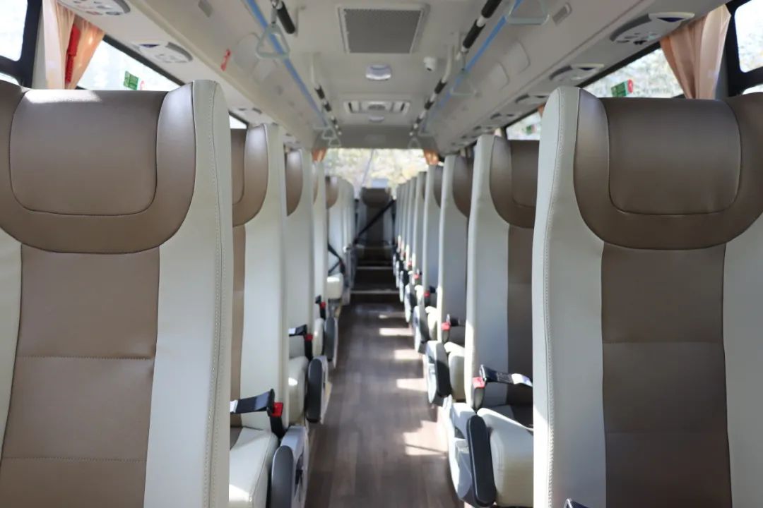 郊区车型的乘客座椅选配了豪华皮质调节座椅,提升了乘客的舒适度;车内前后排区域均配备了USB充电口,方便乘客个性化需求。此次郊区车辆选配的最大亮点是车辆均为大电量车型,底盘部分选用前后盘式制动免维护桥,车桥的空气气囊减震大大提升了车身稳定性,使乘客感觉坐公交车和坐小轿车一样舒适。郊区车型除了增加乘客舒适度以外,还可满足不同群体的包租车需求。