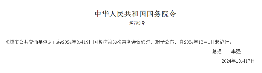 新华社北京10月23日电 国务院总理李强日前签署国务院令,公布《城市公共交通条例》(以下简称《条例》),自2024年12月1日起施行。