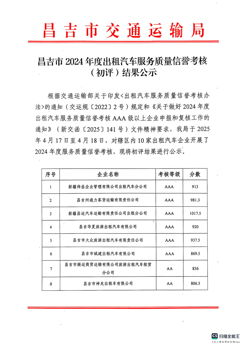【出租汽车服务质量信誉考核信息】昌吉市2024年度出租汽车服务质量信誉考核(初评)结果公示