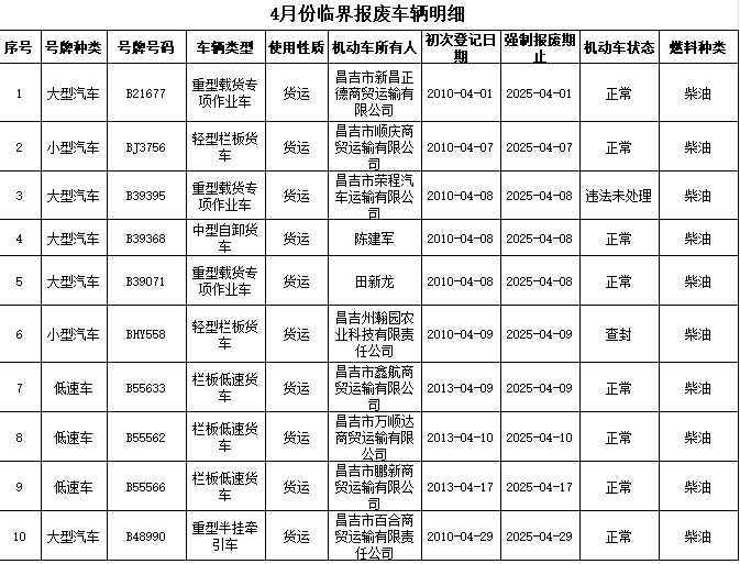 【道路运输监督检查结果信息】4月柴油货车临界报废车辆明细 请尽快办理~