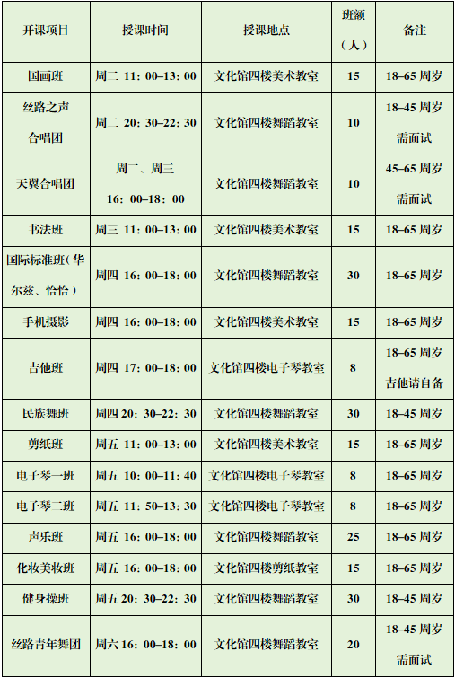(1)学员须遵守《昌吉市文化馆免费开放场地管理规定》,各培训科目每周培训一次,公益资源有限,请珍惜学习机会,培训期间遵守课堂纪律,培训期间若3次未到课者,将取消本期培训资格。