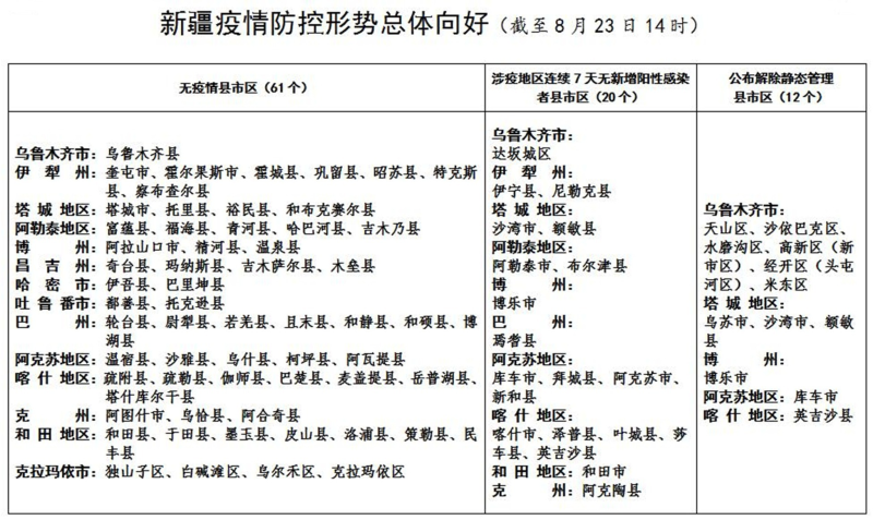 截至8月23日14时,克拉玛依市持续无疫情,和田、阿勒泰、阿克苏、克州、喀什、博州等地州已连续7天以上无新增阳性感染者,其中和田、阿勒泰、阿克苏3个地区已全面清零,塔城地区连续5天无新增阳性感染者;伊宁县、尼勒克县、沙湾市、额敏县、阿勒泰市、布尔津县、博乐市、焉耆县、库车市、拜城县、阿克苏市、新和县、喀什市、泽普县、叶城县、莎车县、英吉沙县、和田市、阿克陶县和达坂城区等20个县(市、区)已连续7天以上无新增阳性感染者。实施静态管理的18个县(市、区)中,乌苏市、沙湾市、博乐市、库车市、额敏县、英吉沙县和乌鲁木齐市天山区、水磨沟区、沙依巴克区、高新区(新市区)、经开区(头屯河区)、米东区等12个县(市、区)已公布解除静态管理。