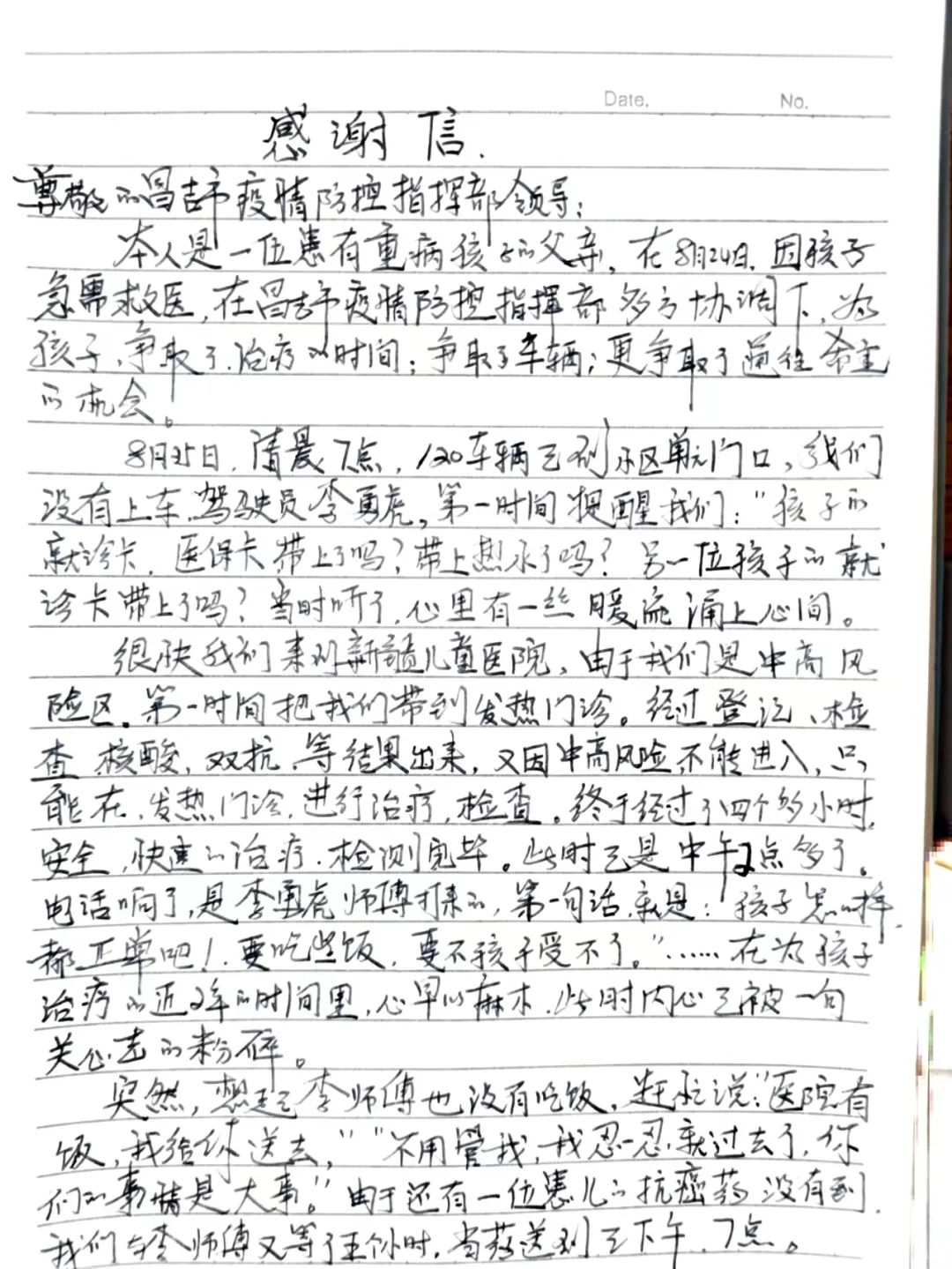 这封感谢信,是一位患有重病孩子的家长在带孩子顺利就诊后,为了感谢昌吉市妇幼保健计划生育服务中心救护车司机李勇虎的无私奉献而写的一封感谢信。这是一位父亲在无助中遇到人间大爱时的真情流露,每每读起,无不让人热泪盈眶。