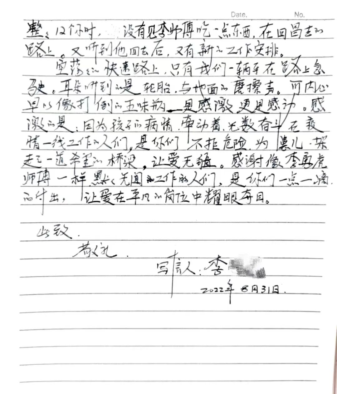 在这12个小时里,李勇虎不忘时时关切询问孩子的治疗结果,并提醒家长和患儿要注意吃饭,而他自己却粒米未进,不吃不喝。“在为孩子治疗的近2年时间里,我的心早已麻木,此时李勇虎师傅一句安慰的话,让我这个七尺男儿也潸然泪下。有这么多好心人的关心,人生哪有过不去的坎。”孩子的家长深受感动,亲手写了一封感谢信,转交到昌吉市疫情防控工作指挥部医疗救治组,感谢疫情期间像李勇虎一样默默付出的人们,正是他们一点一滴的无私奉献,让爱在平凡的岗位中闪耀夺目,护佑着群众健康。