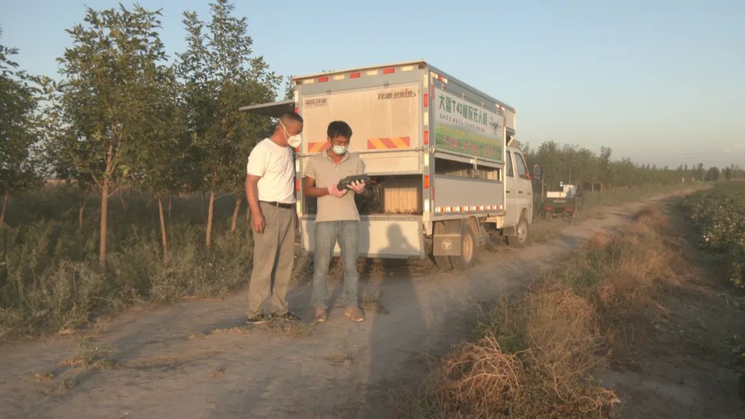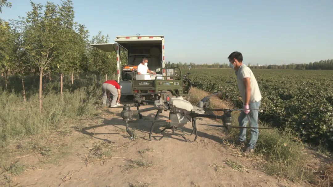 昌吉市绿农植保无人机专业合作社无人机操作手李健:“我们的无人机装药量达40公斤,1次能打18亩地左右,1个小时能打将近100亩地,1天要打10个小时,就是1000亩地到1100亩地,比人工打药省时、省力、提高效率,打得匀称,特别好。”