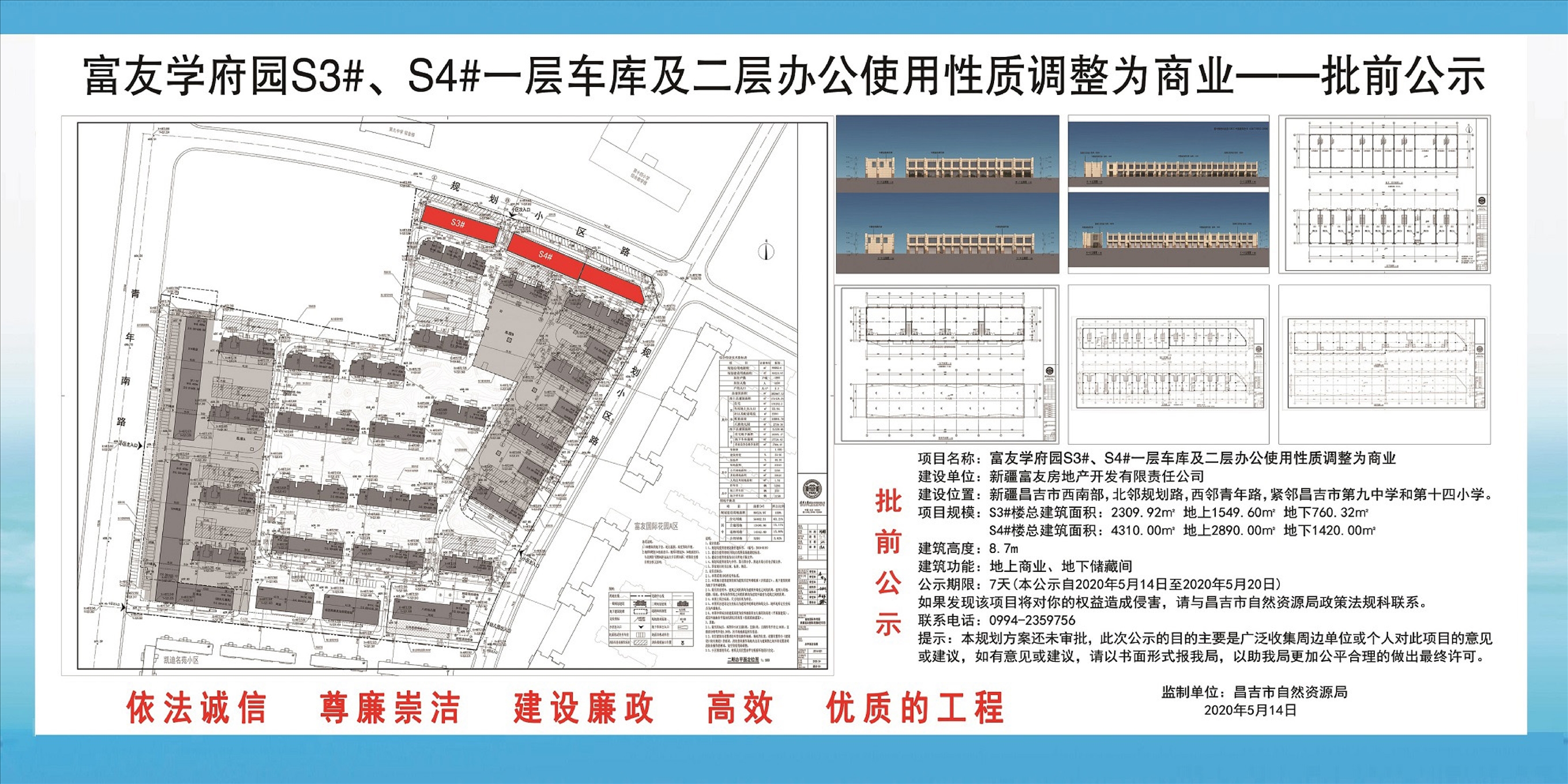 | 名 称 | 富友学府园S3、S4#一层车库及二层办公使用性质调整为商业批前公示 | ||