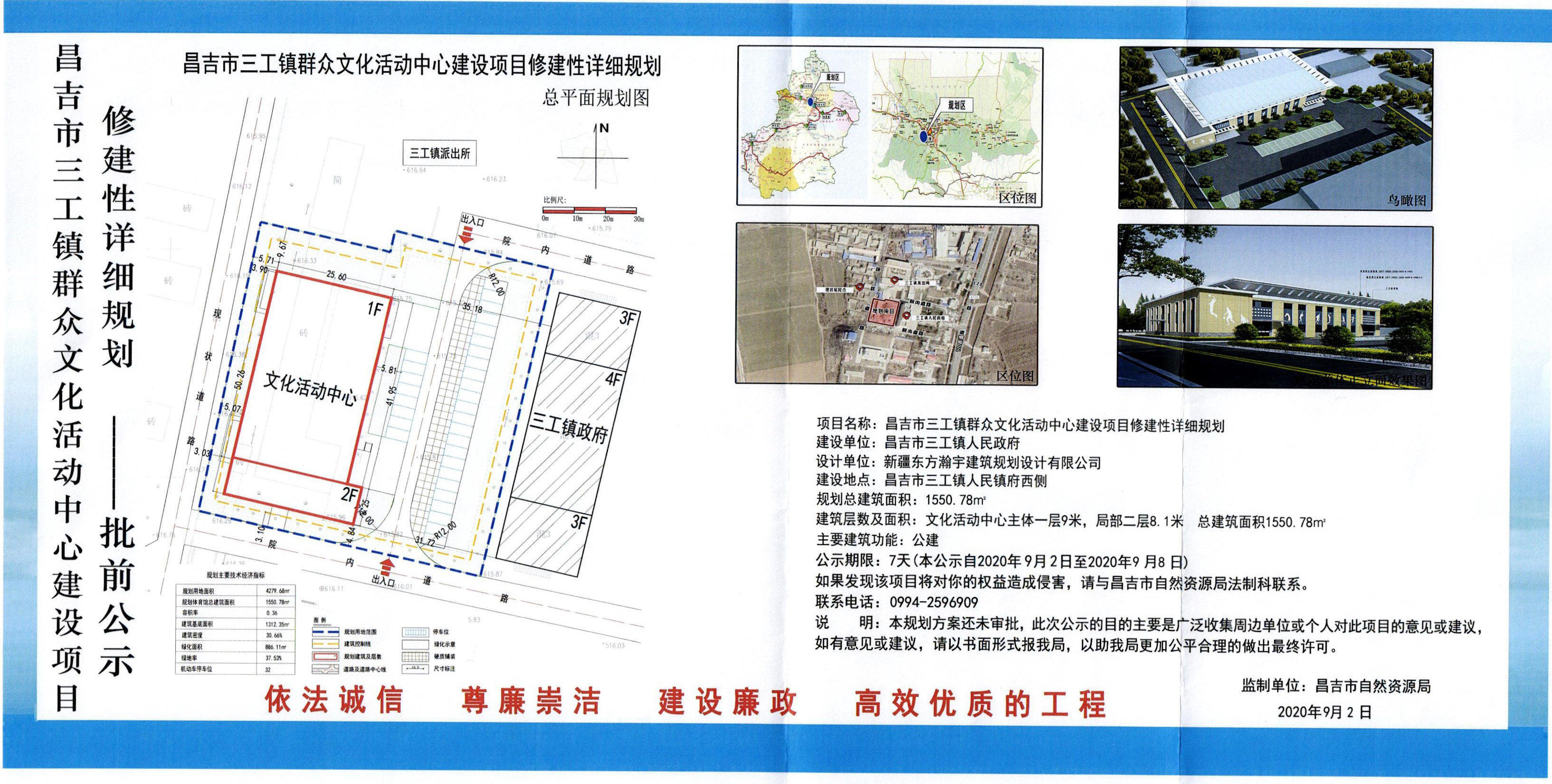 | 名 称 | 昌吉市三工镇群众文化活动中心建设项目修建性详细规划批前公示 | ||