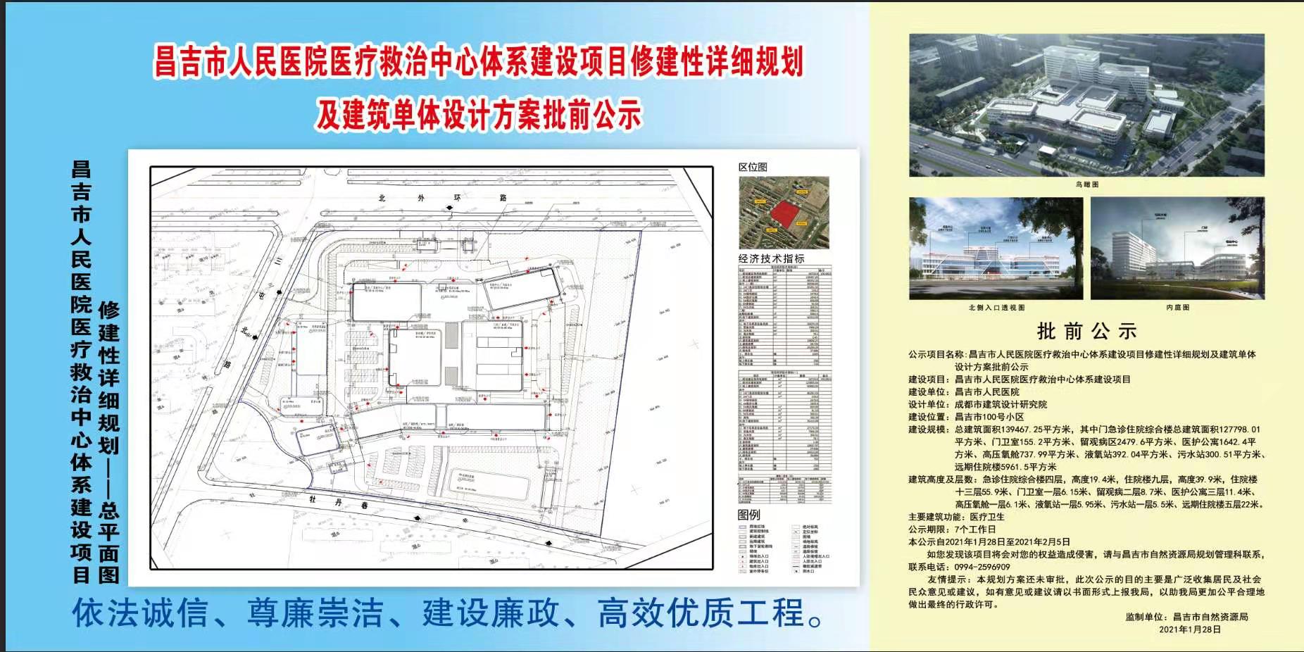 | 名 称 | 昌吉市人民医院医疗救治中心体系建设项目修建性详细规划及建筑单体设计方案批前公示 | ||