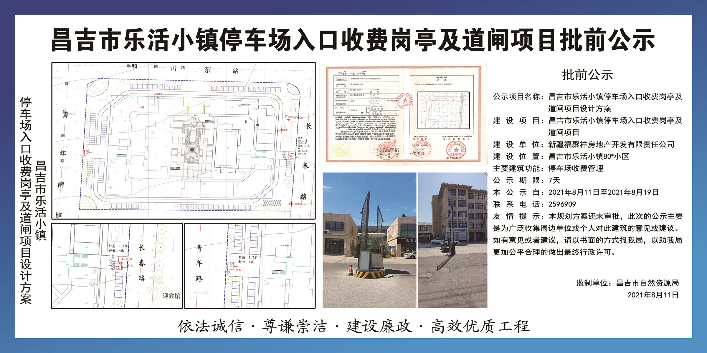 | 名 称 | 昌吉市乐活小镇停车场入口收费岗亭及道闸项目批前公示 | ||