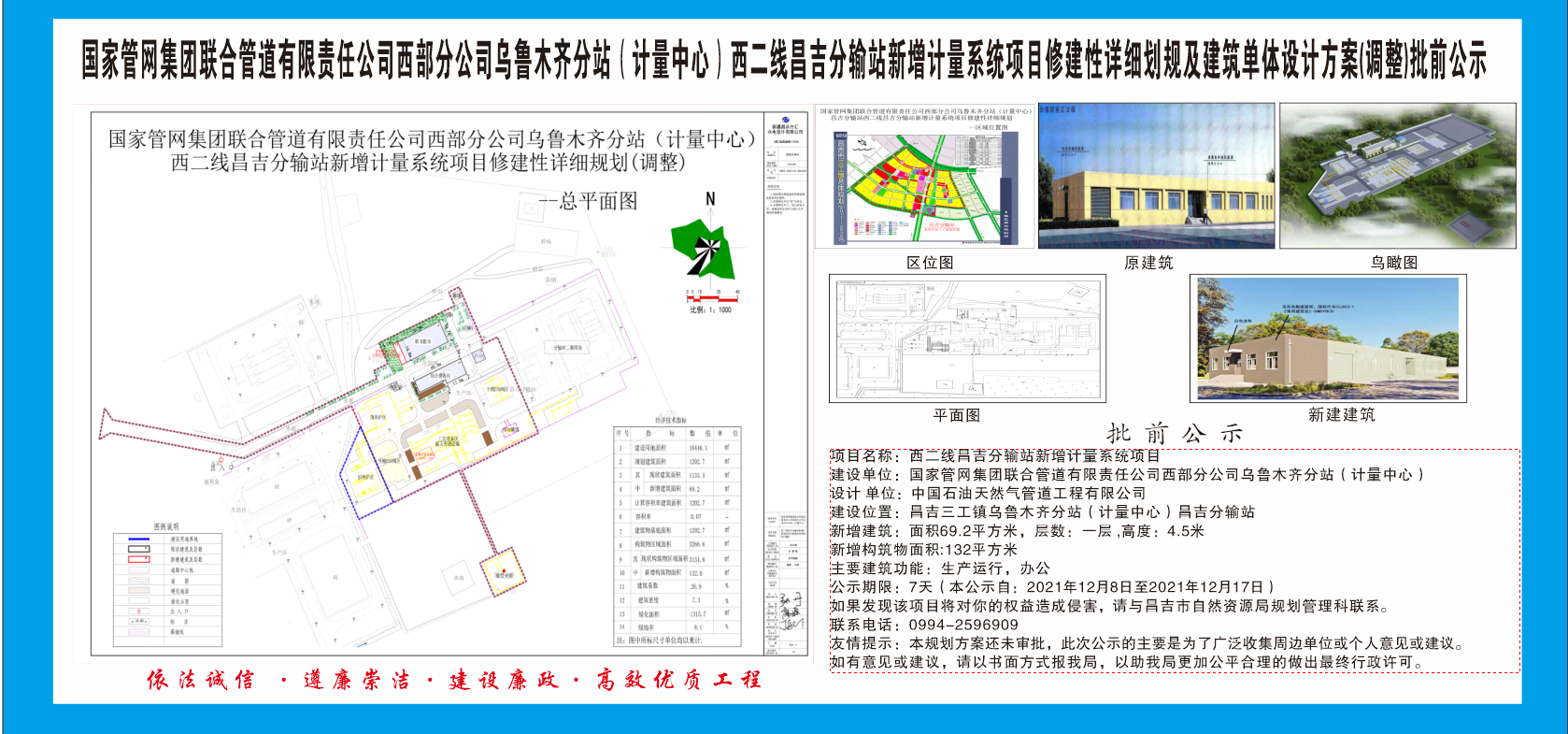 | 名 称 | 国家管网集团联合管道有限责任公司西部分公司乌鲁木齐站西二线昌吉分输站新增计量系统项目修建性详细规划批前公示 | ||