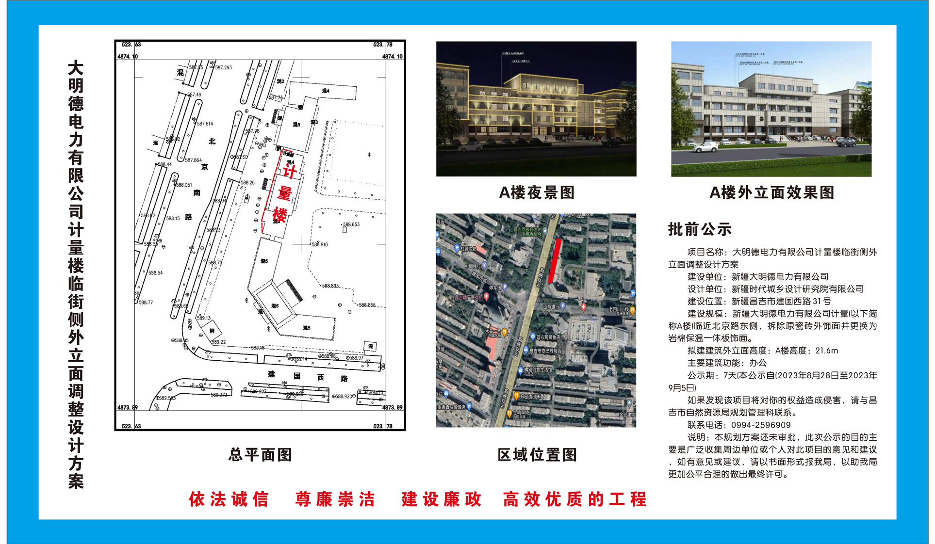 | 名 称 | 大明德电力有限公司计量楼临街侧外立面调整设计方案批前公示 | ||