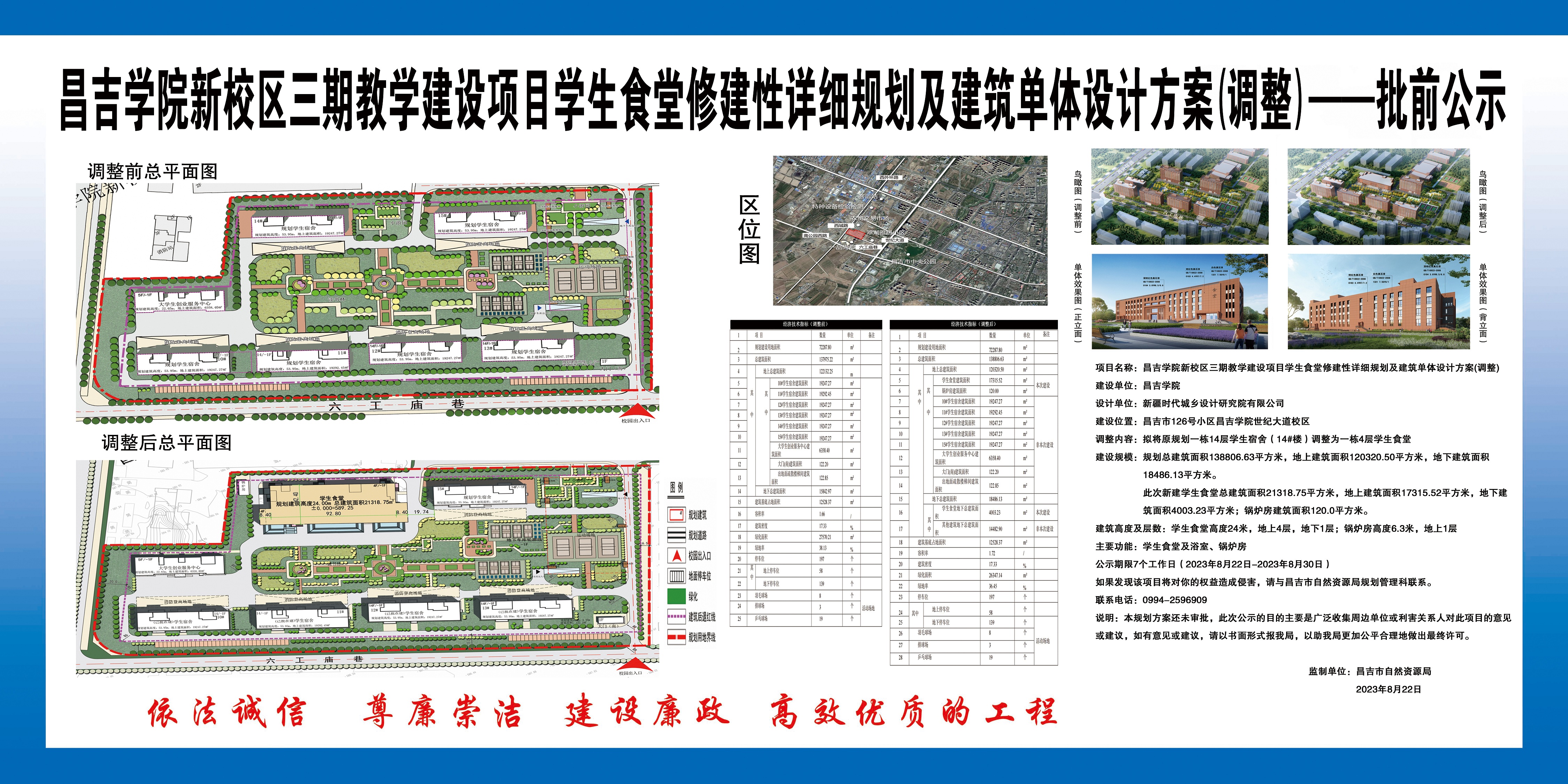 | 名 称 | 昌吉学院新校区三期教学建设项目学生食堂修建性详细规划(调整)批前公示 | ||