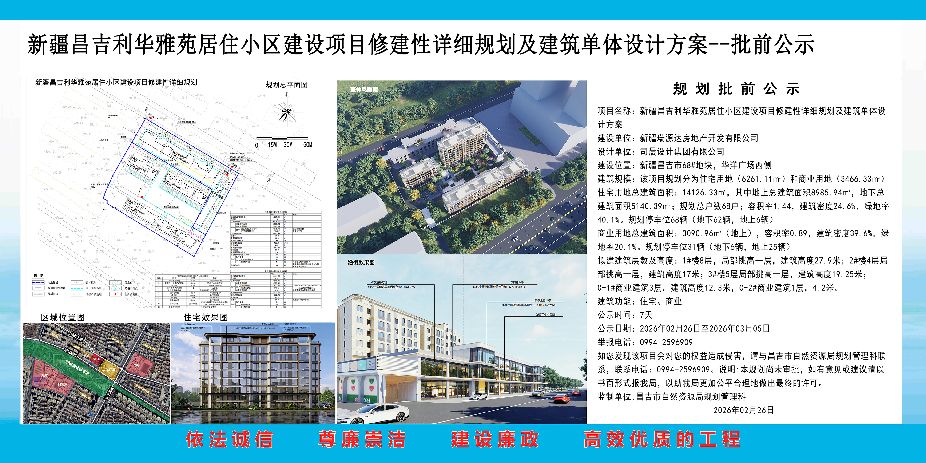| 名 称 | 新疆昌吉利华雅苑居住小区建设项目修建性详细规划及建筑单体设计方案批前公示 | ||
