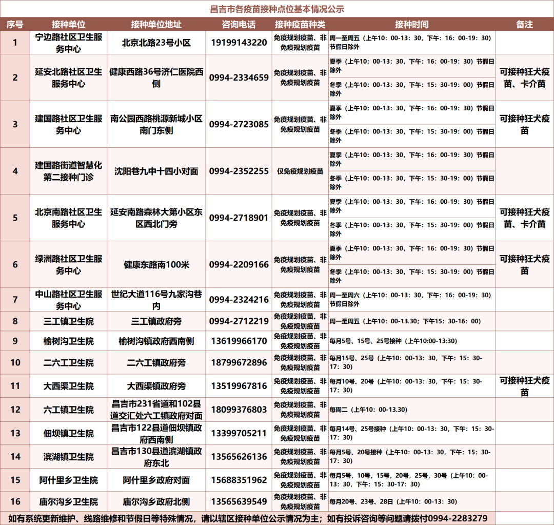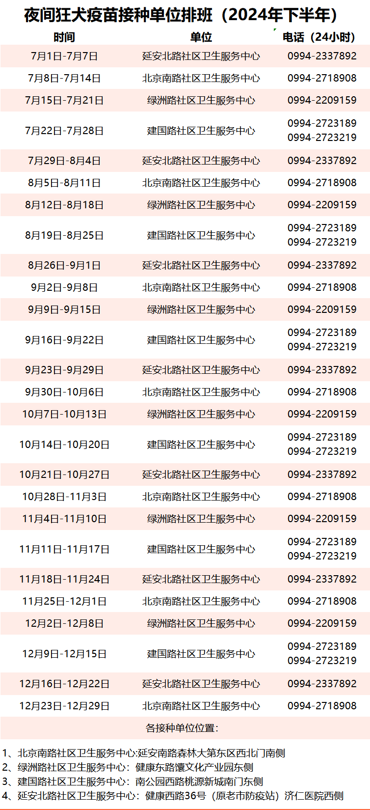 为方便居民就近接种,昌吉市卫健委对有夜间接种需求的居民提供疫苗接种服务,以下为昌吉市狂犬疫苗夜间就诊排班表,如有需要请查收哦!如遇有关疫苗接种的其他问题需要咨询,可于工作时间致电昌吉市疾控中心免疫规划科0994-2283279。