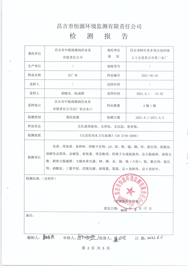 | 名 称 | 2021年5月、6月水质检测报告 | ||