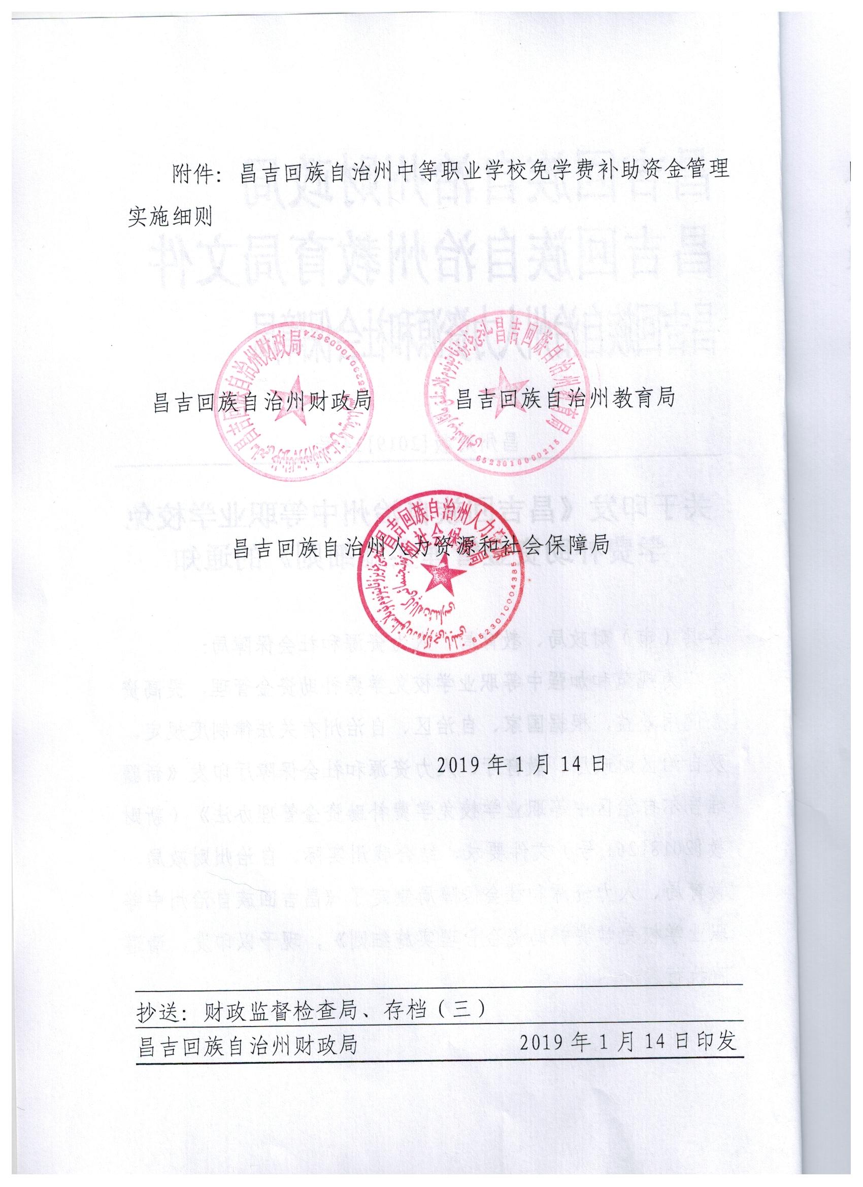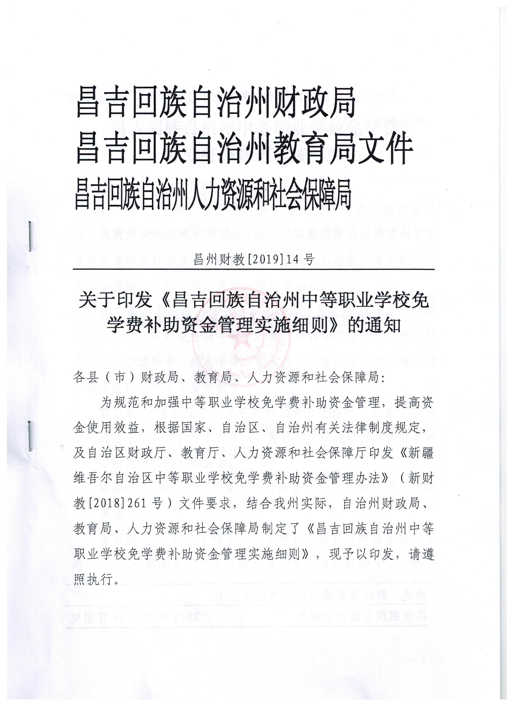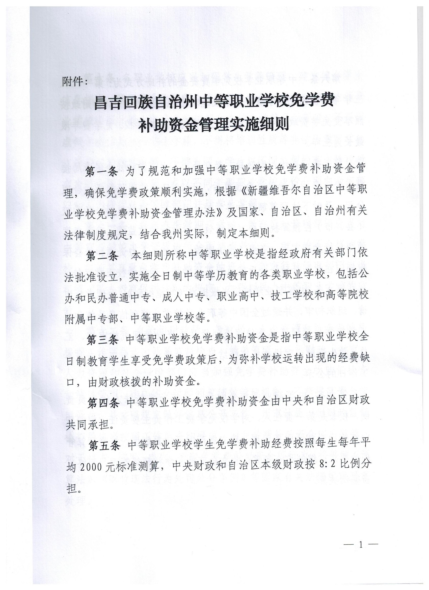 | 名 称 | 昌吉回族自治州中等职业学校免学费补助资金管理实施细则 | ||