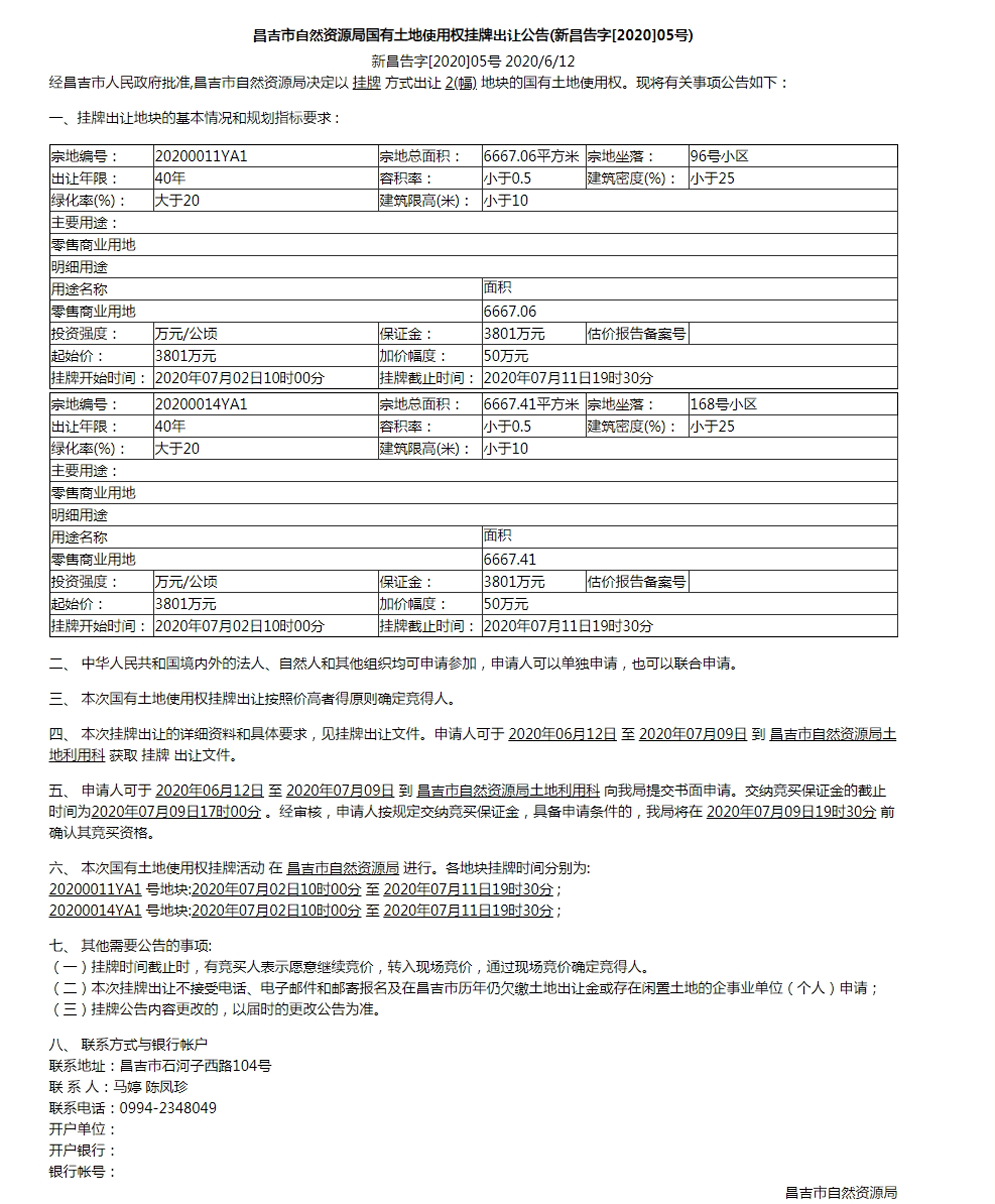 昌吉市自然资源局国有土地使用权挂牌出让公告(新昌告字[2020]05号)