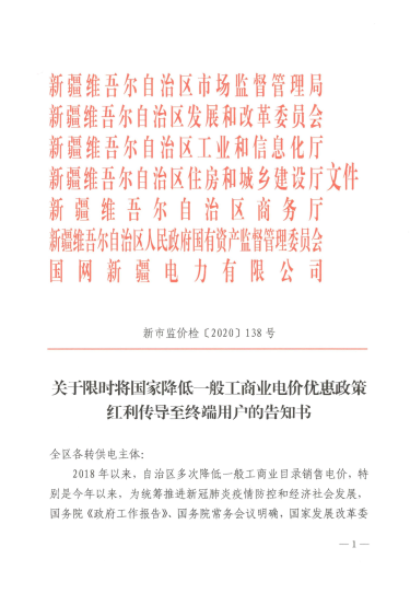 | 名 称 | 关于限时将国家降低一般工商业电价优惠政策红利传导至终端用户的告知书 | ||
