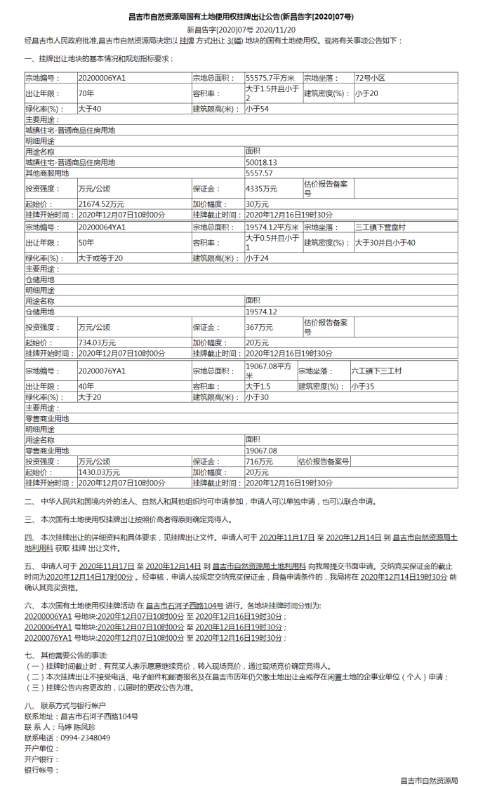 昌吉市自然资源局国有土地使用权挂牌出让公告(新昌告字[2020]07号)