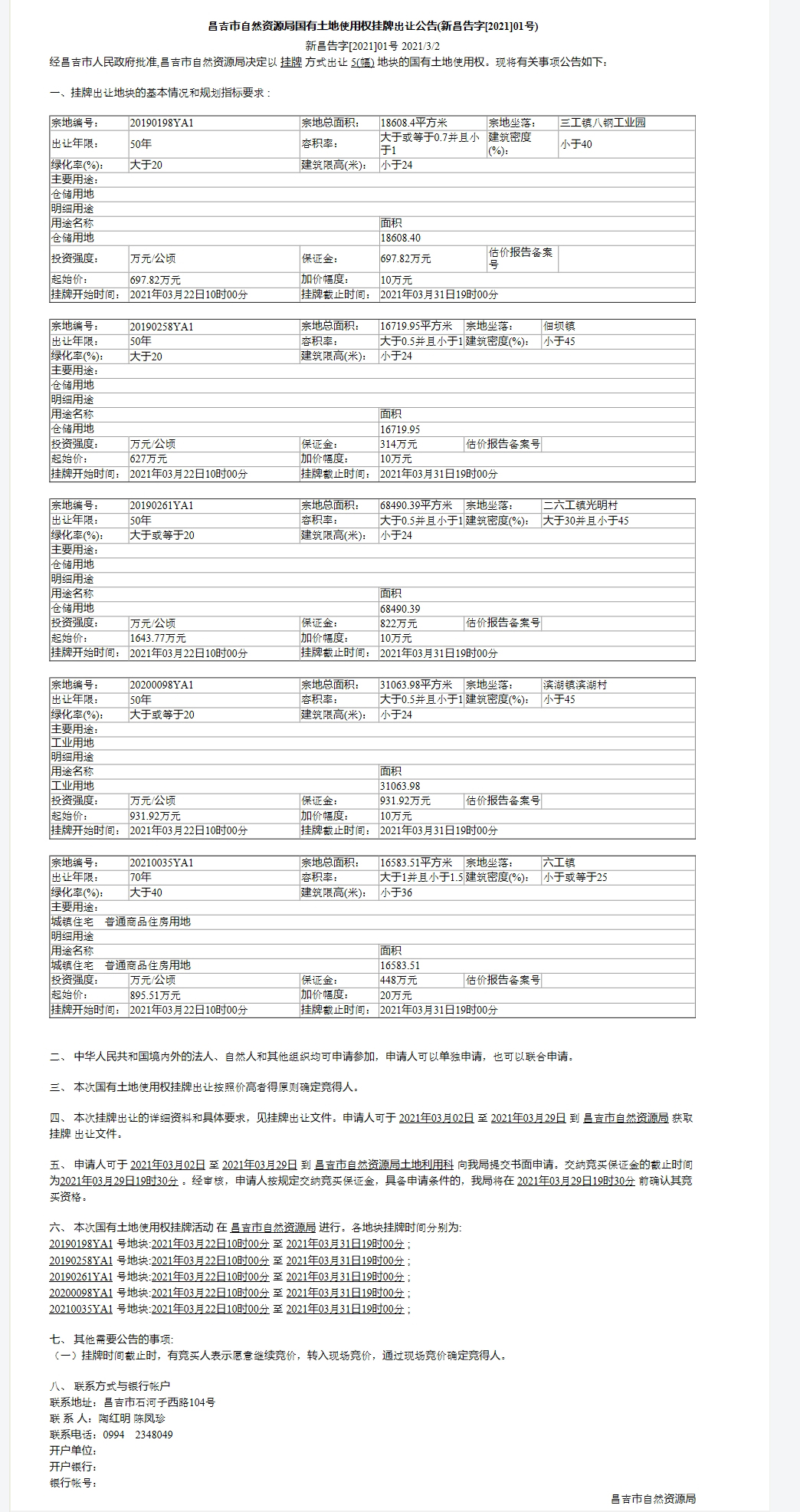 昌吉市自然资源局国有土地使用权挂牌出让公告(新昌告字[2021]01号)
