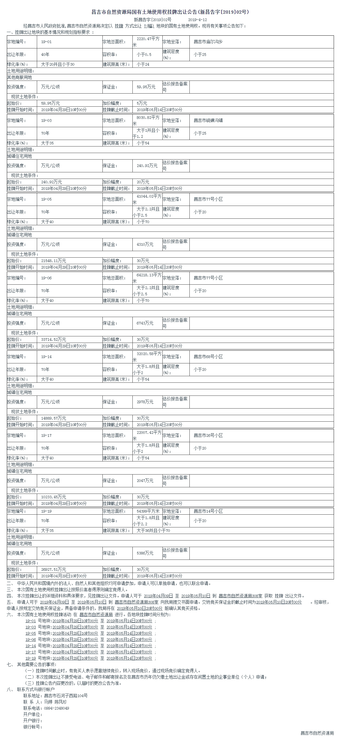 昌吉市自然资源局国有土地使用权挂牌出让公告(新昌告字[2019]02号)