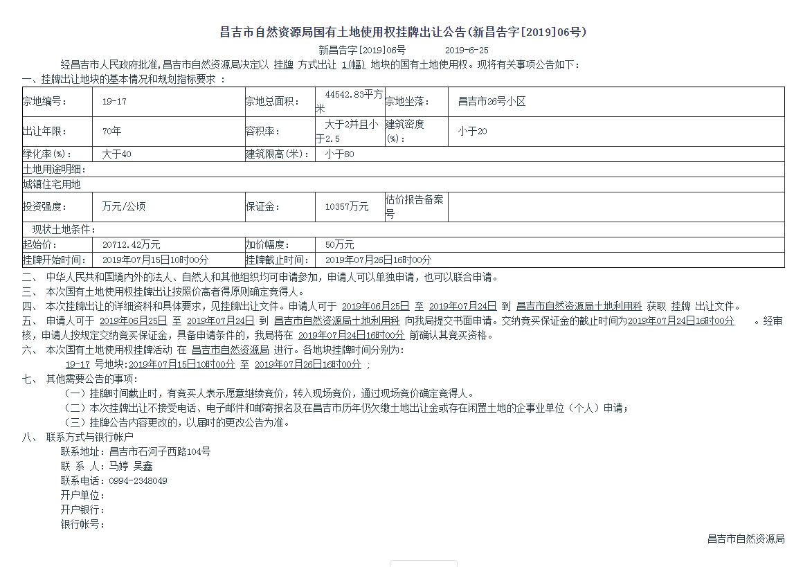 昌吉市自然资源局国有土地使用权挂牌出让公告(新昌告字[2019]06号)