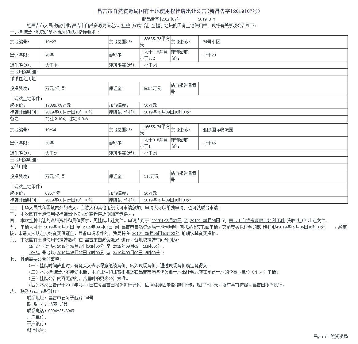 昌吉市自然资源局国有土地使用权挂牌出让公告(新昌告字[2019]07号)