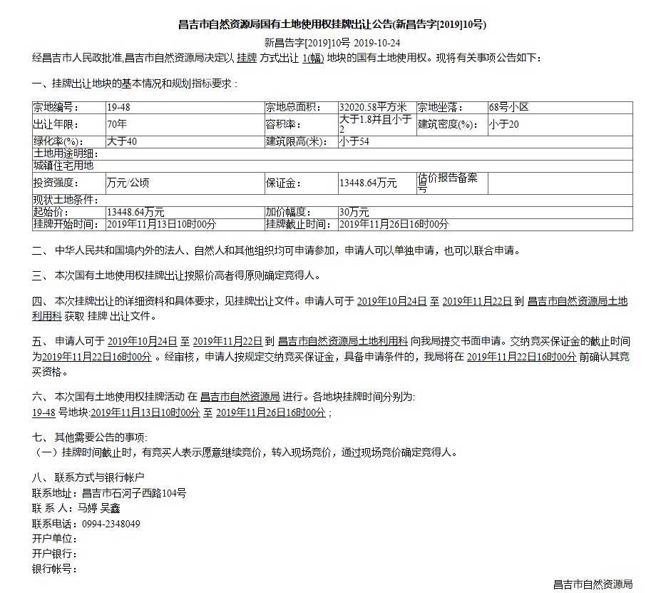 昌吉市自然资源局国有土地使用权挂牌出让公告(新昌告字[2019]10号)