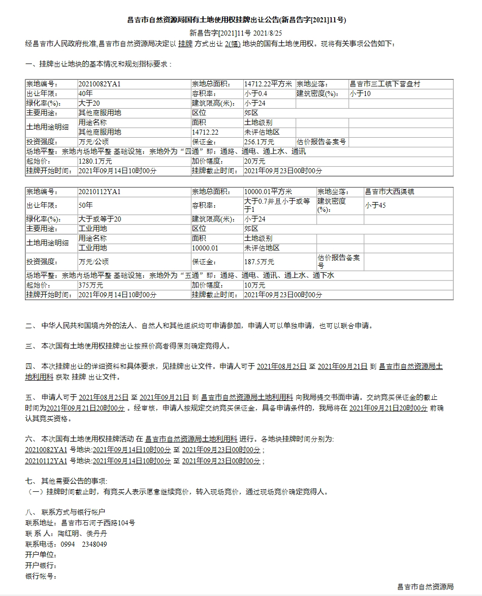 昌吉市自然资源局国有土地使用权挂牌出让公告(新昌告字[2021]11号)