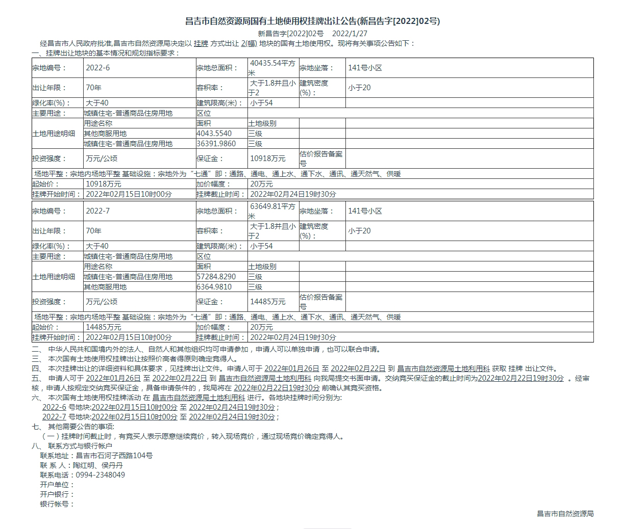 昌吉市自然资源局国有土地使用权挂牌出让公告(新昌告字[2022]02号)