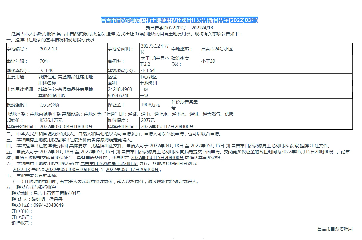 昌吉市自然资源局国有土地使用权挂牌出让公告(新昌告字[2022]03号)
