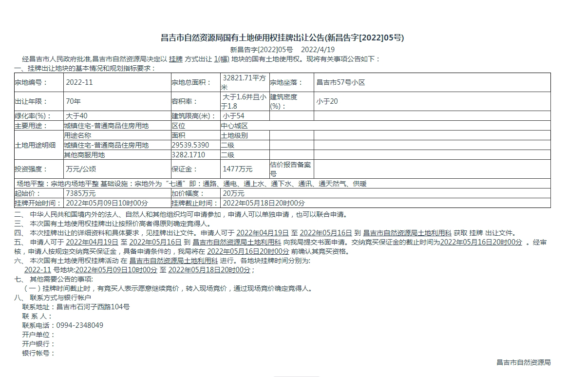 昌吉市自然资源局国有土地使用权挂牌出让公告(新昌告字[2022]05号)