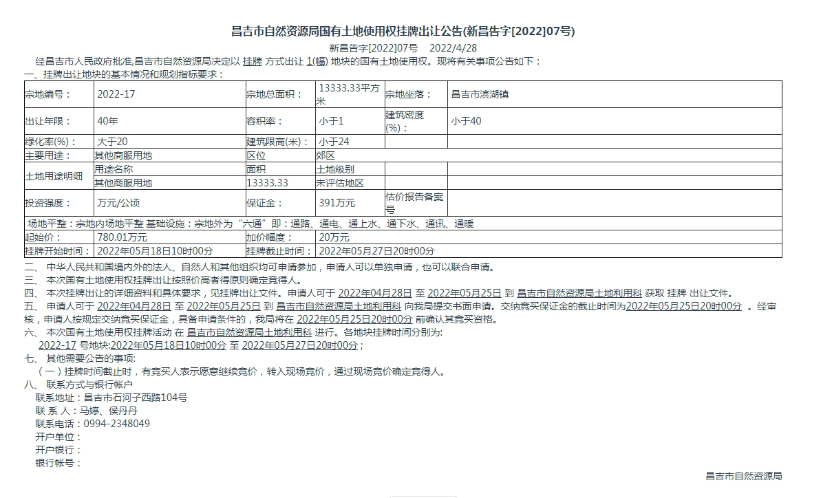 昌吉市自然资源局国有土地使用权挂牌出让公告(新昌告字[2022]07号)