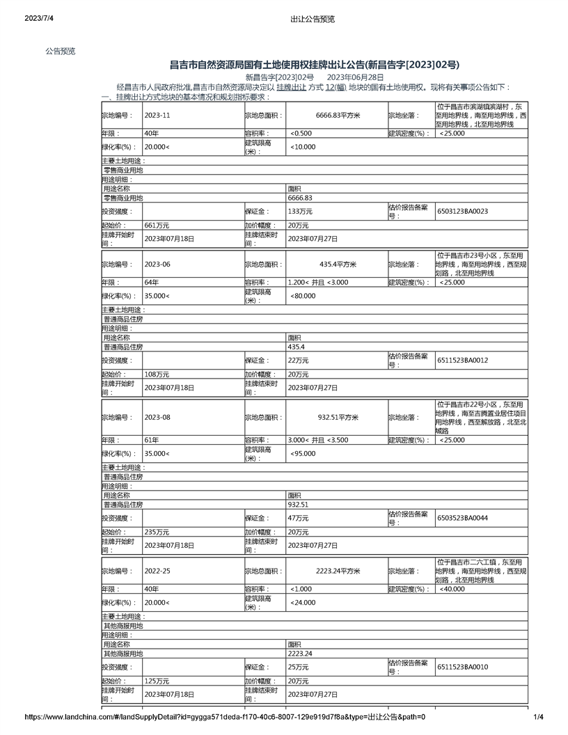 昌吉市自然资源局国有土地使用权挂牌出让公告(新昌告字[2023]02号)