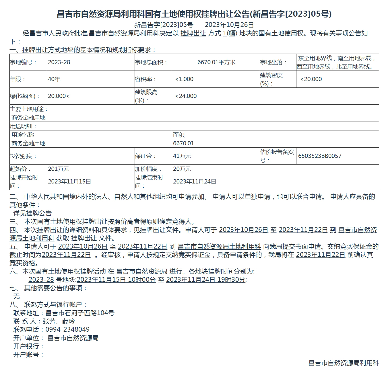 昌吉市自然资源局国有土地使用权挂牌出让公告(新昌告字[2023]05号)