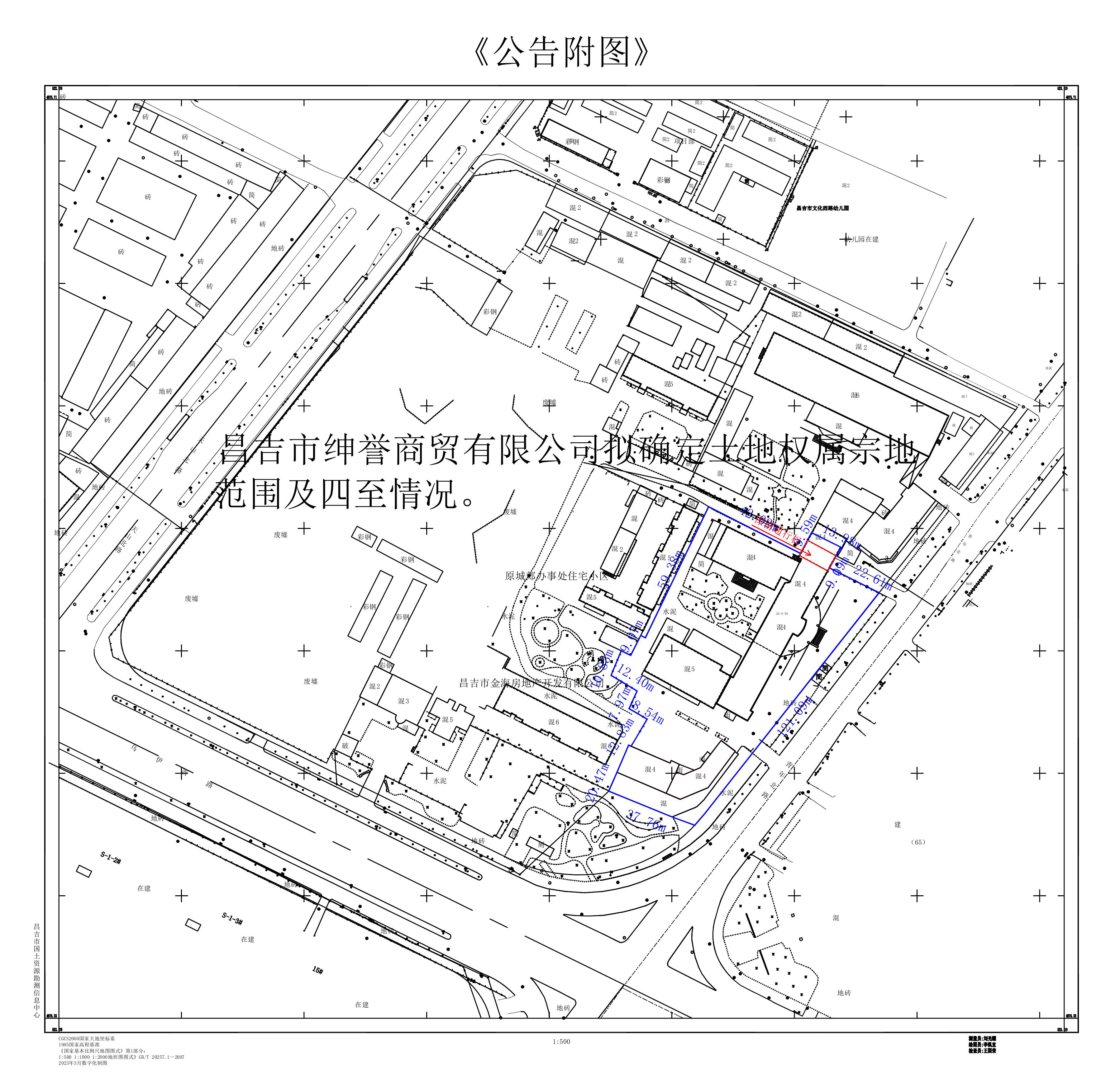 国有土地使用权确权公告 昌吉市绅誉商贸有限公司于2023年2月向我局提交了《申请报告》,申请对青年路24号小区3丘(原昌吉市第二人民医院)的国有土地使用权进行确权。 申请确权地块位于昌吉市青年路24号小区3丘,东至青年北路、西至昌吉市金海房地产开发公司住宅小区、原城郊办住宅小区,南至绿化带,北至巷道。经实地调查勘测,24区3丘内现有4栋楼,分别为:24-3-37栋、24-3-38栋、24-3-39栋、24-3-40栋,现状土地使用总面积为7493.94平方米。房产登记信息为: 1、24-3-37栋:昌市房字第00231375号,房屋所有权人昌吉市绅誉商贸有限公司,房屋产权面积2314.02平方米; 2、24-3-38栋:昌市房字第00233932号,房屋所有权人昌吉市绅誉商贸有限公司房屋产权面积6461.64平方米。 3、24-3-39栋:昌市房字第00233942号,房屋所有权人昌吉市绅誉商贸有限公司,房屋产权面积3373.44平方米。 4、24-3-40栋:昌市房字第00233943号,房屋所有权人昌吉市绅誉商贸有限公司,房屋产权面积2341.45平方米。 根据《中华人民共和国物权法》、《中华人民共和国土地管理法》、《不动产登记暂行条例》、《不动产登记暂行条例实施细则》等相关法律法规规定及自然资源部《关于加快解决不动产登记若干历史遗留问题的通知》自然资发〔2021〕1号文件第一条,现对昌吉市绅誉商贸有限公司24区3丘土地使用权进行公告(具体宗地四至及范围见公告附图)。 公告期为15个工作日,公告期限为2023年11月9日至2023年11月29日。对以上公告内容有异议者,请于2023年11月29日前向昌吉市自然资源局书面提出,并提供相关证明材料,联系电话:0994-2523760。公告期内无异议,昌吉市自然资源局将按规定办理。 昌吉市自然资源局 2023年11月9日