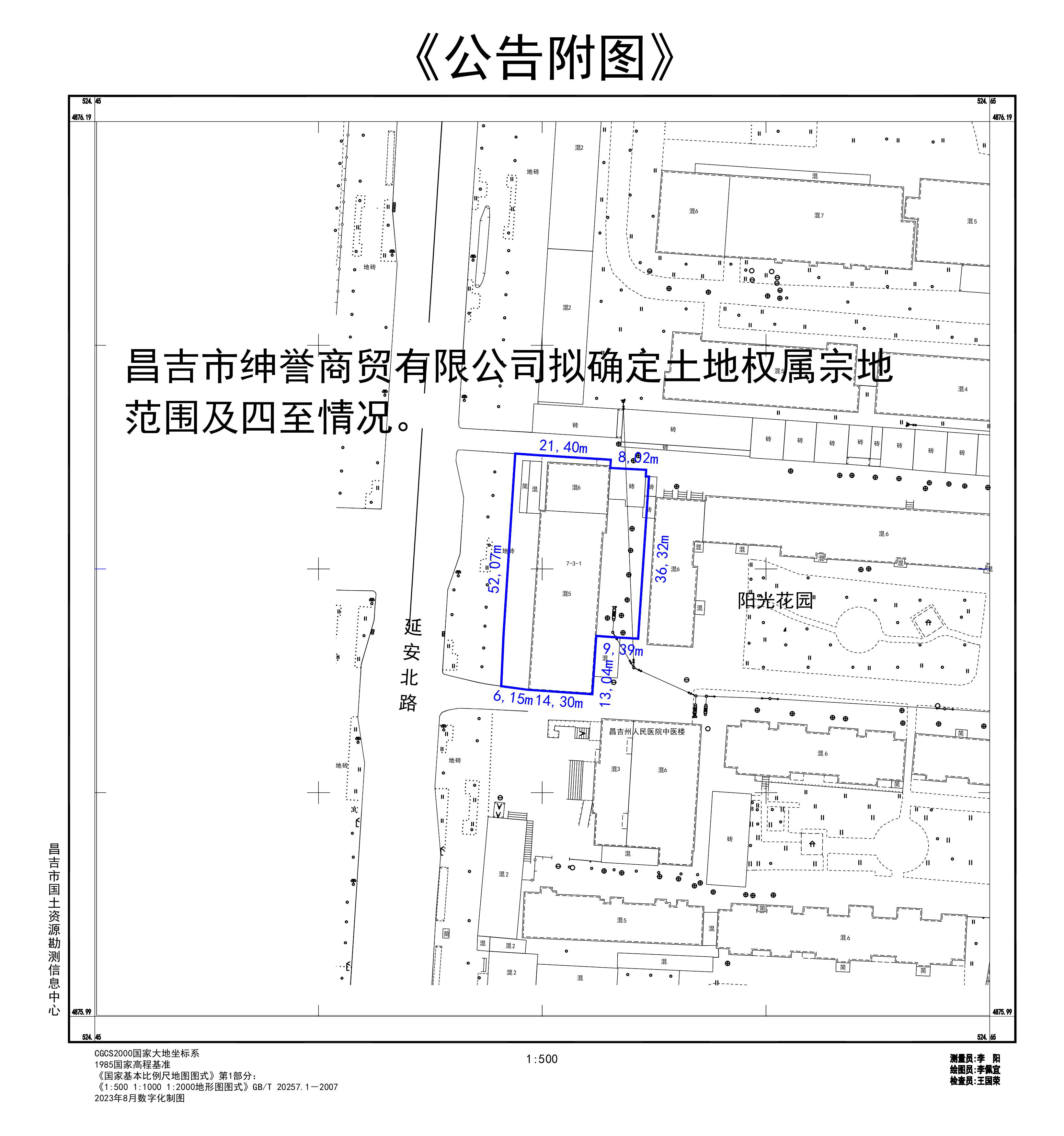 国有土地使用权确权公告 昌吉市绅誉商贸有限公司于2023年2月向我局提交了《申请报告》,申请对位于延安北路7区3丘1栋中原房产证号昌市房字第00214275号房产产权对应的国有土地使用权进行确权。 申请确权地块位于昌吉市延安北路7号小区,南至昌吉州人民医院,西至延安北路,北至巷道,东至昌吉环宇物业发展有限公司住宅小区。经实地勘测,7区3丘1栋现状土地使用总面积为1439.40平方米。根据2023年3月《房产面积测量成果报告》数据,7区3丘1栋总建筑面积3805.79平方米,其中昌吉市绅誉商贸有限公司房屋产权面积948.25平方米(分别为二层745.89平方米,六层202.36平方米),房屋产权证号:昌市房字第00214275号。 根据《中华人民共和国物权法》、《中华人民共和国土地管理法》、《不动产登记暂行条例》、《不动产登记暂行条例实施细则》等相关法律法规及自然资源部《关于加快解决不动产登记若干历史遗留问题的通知》自然资发〔2021〕1号文件第一条,现对7区3丘1栋土地使用范围、昌吉市绅誉商贸有限公司昌市房字第00214275号房产对应土地使用权进行公告(具体宗地四至及范围见公告附图)。 公告期15个工作日,公告期限为2023年11月9日至2023年11月29日。对以上公告内容有异议者,请于2023年11月29日前向昌吉市自然资源局书面提出,并提供相关证明材料,联系电话:0994-2523760。公告期内无异议,昌吉市自然资源局将按规定办理。 昌吉市自然资源局 2023年11月9日