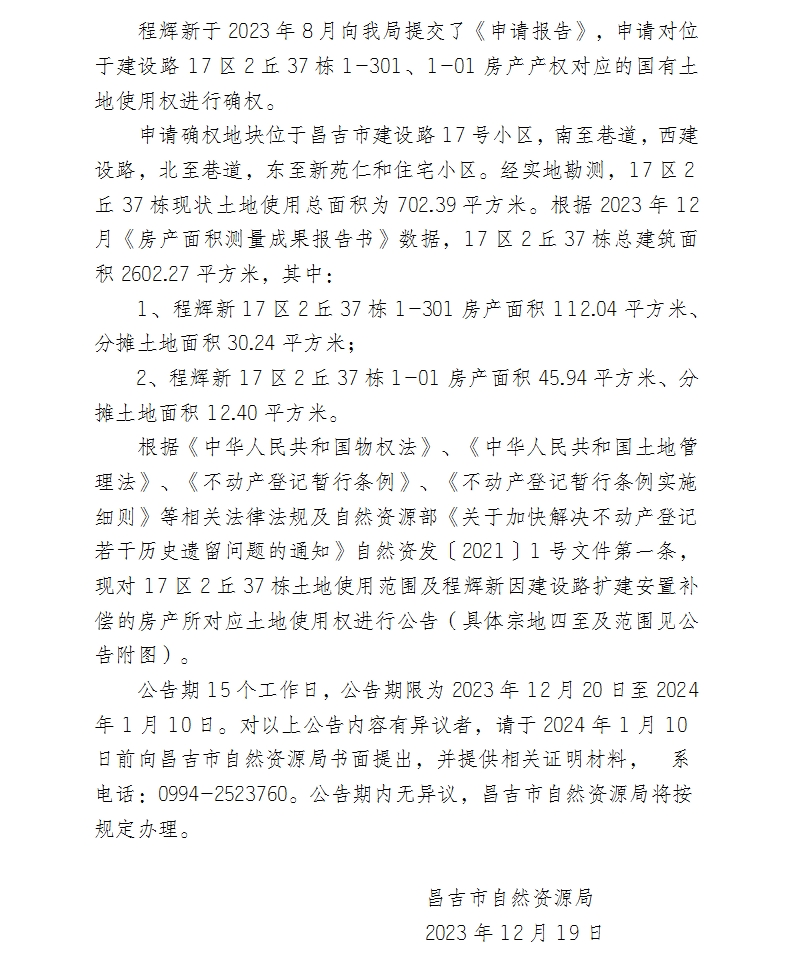 | 名 称 | 国有土地使用权确权公告(程辉新) | ||